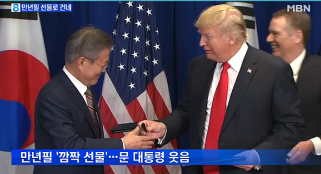 - 셋째, 펜은 '개인적 친분'을 가장한 정치적 메시지다. 트럼프 대통령은 '펜'에 대한 언급을 통해 개인적인 친분과 호감을 내비쳤지만, 그 이면에는 정치적 메시지가 숨어있었을 가능성이 크다. 그는 자신의 지지층에게 "나는 한국의 중요한 물건까지도 자유롭게 가져올 수 있을 만큼 강한 협상가"라는 이미지를 심어주려 했을 수도 있다. 혹은 한국 측에 "나는 사소한 것까지도 놓치지 않고 협상을 주도할 것"이라는 경고를 보냈을 수도 있다.